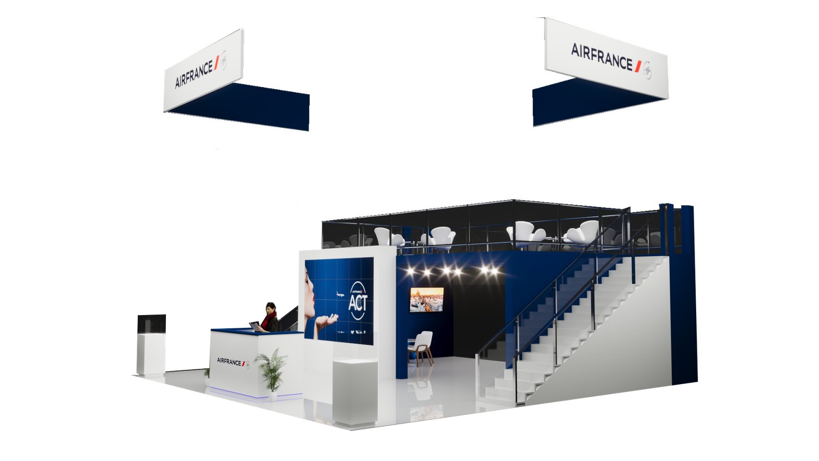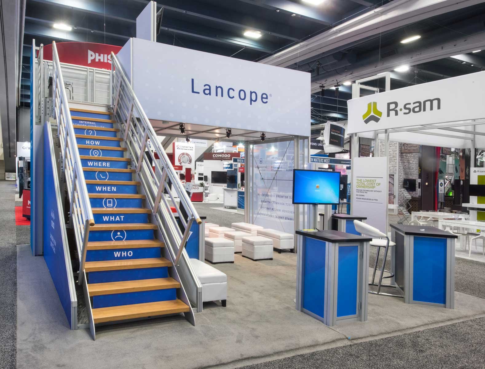 Two story Trade Show Displays or double deck booths are becoming more popular these days for exhibitors. Double deck exhibits allow exhibitors to maximize their space with room on the second floor for lounges, conference rooms or even private demo rooms that create a VIP experience. Double deck booths can allow exhibitors to gain more space without the expense of renting a larger floor space. The double deck booth structure can be used in spaces as small as 20×20. Double deck exhibits project a solid image of stability and portray your company as an industry leader.