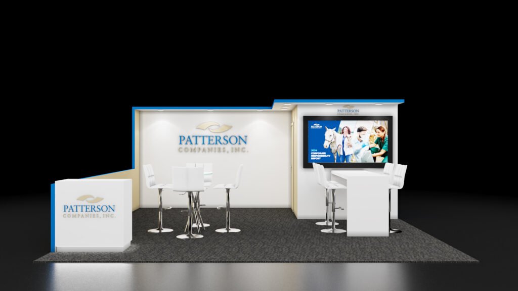 Versatile and engaging, this 20×20 exhibit includes stem lighting, slatwall paneling, and dynamic custom graphics. Its open layout and dual reception kiosks create an inviting space for attendees.